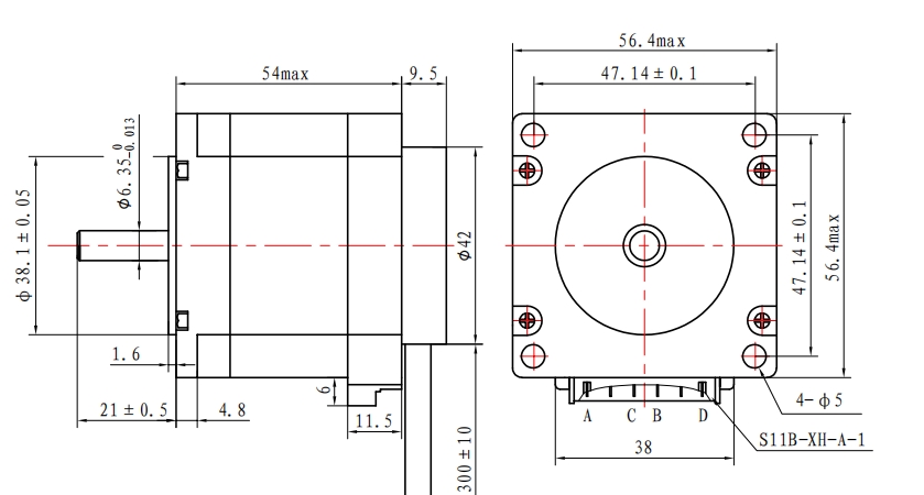 Model | Holding Torque | Rated Current | Resistance per phase | Inductance per phase | Detent torque | Rotor inertia | Lead wire | Motor length |